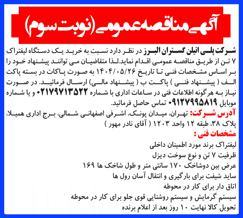 شرکت پلی اتیلن گستران البرز در نظر دارد نسبت به خرید یک دستگاه لیفتراک 7 تن از طریق مناقصه عمومی اقدام نماید.