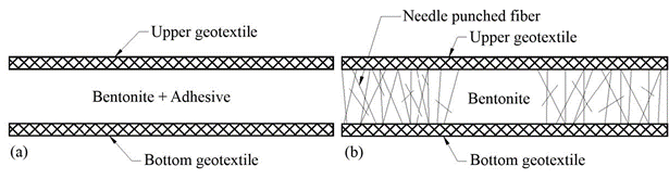 در قسمت (a) شکل بالا، پوشش ژئوتکستایل یک لایه نازک از بنتونیت را محصور کرده که به وسیله چسب غیر آلاینده به هم متصل شده اند. در قسمت (b)، لایههای ژئوتکستایل توسط فرایند سوزن زنی با لایهی بنتونیت میانی به هم متصل شده اند. در قسمت (c) لایههای ژئوتکستایل توسط فرایند دوخت به لایه بنتونیت میانی متصل شده اند و در قسمت (d) لایه بنتونیت به همراه چسب به لایه ژئوممبران متصل شده است.