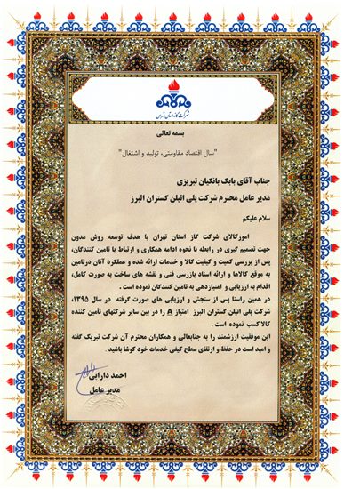 دريافت لوح تقدير توليدکننده نمونه شرکت گاز استان تهران سال 1395