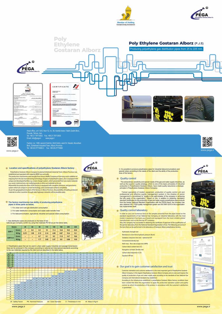 This company uses machines purchased from the German company Krauss Maffei and has advanced equipment such as screen charger, which prevents the entry of any waste materials such as wood, metal, unmelted granules, etc., as well as complete ultrasonic equipment and Graviometric has the ability to produce high quality polyethylene pipes for gas supply purposes with PE100 raw materials and the dimensions in the table below.